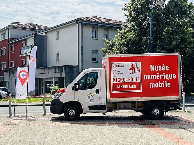 La Micro Folie itinérante de la Communauté de communes Centre Tarn, présentée par Marie Amiel, équipée d’un projecteur, de tablettes, d’un système de sonorisation mobile et de casques de réalité virtuelle. Cette Micro Folie, transportable grâce à un camion, permet d’animer des miniconférences et ateliers culturels sur tout le territoire. En savoir plus sur le dispositif.